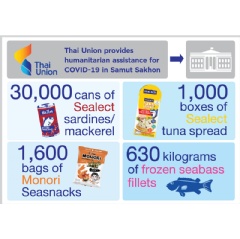 In line with its commitment to support those communities where it operates, Thai Union Group PCL has donated 30,000 cans of SEALECT sardines and mackerel, 1,000 boxes of SEALECT tuna spread and crackers, 1,600 bags of Monori Seasnacks, as well as 630 kilograms of frozen seabass fillets to the COVID-19 Donation Center at Samut Sakhon Provincial Hall.