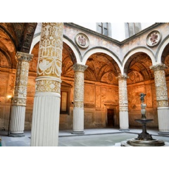 The courtyard, which is accessed from the main door of the Palazzo Vecchio on the Piazza della Signoria, was designed in 1453 by Michelozzo. In 1565, for the wedding between Francesco I de’ Medici, son of Cosimo I, and Joanna of Austria, sister of Emperor Maximilian II, the courtyard was transformed and embellished according to a design by Giorgio Vasari. The insignia of the churches and guilds of the city’s arts and crafts appear in the lunettes around the portico, while in honor of Joanna of Austria, the lower panels feature city views of the Habsburg Empire painted by Bastiano Lombardi, Cesare Baglioni and Turino Piemontese. In the center of the courtyard, to replace the ancient well, a porphyry fountain was added, based on a design by Vasari and with the probable collaboration of Bartolomeo Ammannati. Resting on a large octagonal base with two round steps, it has a porphyry column supporting a marble basin. The bronze statue of ‘Putto con delfino’ by Andrea del Verrocchio (around 1470) was placed on the fountain in 1557 and then moved in 1959 to the second floor of the building, with a copy placed in the courtyard.