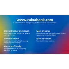 CaixaBank has just launched its new corporate website, www.caixaBank.com, which transmits the bank’s brand positioning and values and features regulatory compliance and the latest online trends to make it a more visual, effective communication tool. Its aim is to strengthen the relationship with the bank’s different stakeholders. The fundamental priority was therefore to enhance the user experience by delivering the information they want quickly and easily, presented in new, enriched multimedia formats. To do this, the browsing structure has been simplified, with a main menu presenting all the content relevant to the user in five sections. Thus, the new menu is more visual and structured, with a simpler, more intuitive layout to make it easier to access information. The new portal also offers a more modern look & feel, with typography featuring high contrast and highlights with greater photographic impact, in line with the organisation’s new brand image.
