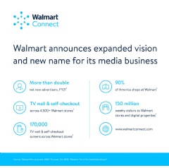 Today, Walmart announced an expanded vision and new name for its media business, now called Walmart Connect. Formerly known as Walmart Media Group, the new name reflects the company’s unique ability to accelerate the connection between brands and its 150 million weekly customers. Walmart Connect is creating ways for partners to be top of mind in Walmart stores, on its digital properties and across the internet in a way that is additive to customers’ experiences. The business will harness Walmart’s vast omnichannel presence, the power of its closed-loop system and knowledge of its customer base to bring brands measurably closer to their intended audience no matter how they shop.