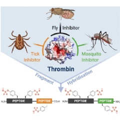 To cover all three sites with one drug, the researchers chose three natural inhibitors, which were then patched together. They connected the tsetse thrombin inhibitor, or TTI, from the tsetse fly with either an inhibitor peptide called variegin from a tropical tick or the inhibitor anophelin from the malaria mosquito Anopheles. The resulting hybrid peptides were designed to span all three binding sites of thrombin.