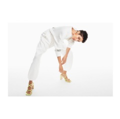 The first collection to launch under the collective is Science Story, which pays tribute to the brilliant minds behind fabrications of the future. With it, we introduce new materials such as EVO by Fulgar®, a bio-based yarn derived from castor oil, and Desserto, which is a plant-based alternative to leather, produced from cactus plants. Key womenswear pieces include the wide-leg bright white jeans with removable double waistband, the lightly-cropped chalk-white shirt with oversized breast-pocket and the cuffed tracksuit. Energetic and bold accessories are the edgy antidote to the collection’s clean and classic clothing; the chunky necklace with orange swirls and rhinestone detailing, coordinating statement loop rhinestone earrings, high-heeled green strap sandals and recycled plastic blue sunglasses with a double-lens frame.