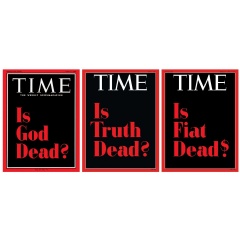 Inspired by the “Is God Dead?” cover from April 8, 1966, the original NFT rendition, released amid the stratospheric rise of NFTs and adoption of cryptocurrencies, returns to the stark black field and red bold typography to once again ask a topical question, “Is Fiat Dead?”