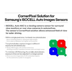 “The new ISOCELL Auto 4AC combines Samsung’s innovative and market-proven image sensor technologies with a unique CornerPixel™ solution for advanced HDR and LFM capabilities, offering exceptional viewing experiences regardless of lighting conditions,” said Duckhyun Chang, executive vice president of sensor business at Samsung Electronics. “Starting with the ISOCELL Auto 4AC, we plan to expand our automotive sensor lineup to areas such as camera monitor systems (CMS), autonomous driving and in-cabin monitoring.”