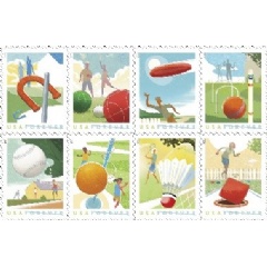 This pane of 16 Forever stamps features eight unique designs illustrating a variety of backyard games — badminton, bocce, cornhole, croquet, flying disc, horseshoes, tetherball and a variation on pick-up baseball. Each design emphasizes the movement of the game pieces, giving a dynamic quality to the artwork. Using a simplified style that evokes the nostalgic feeling of playing backyard games as a child, illustrator Mick Wiggins created the digital illustrations with the iconography of vintage sporting posters in mind.