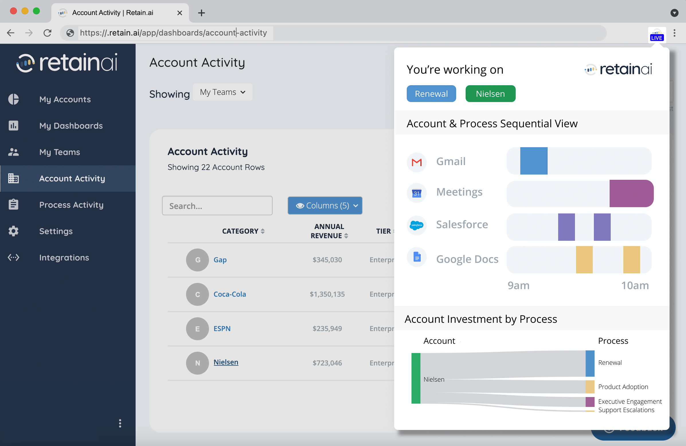 Retain’s CIE gives a unified view of customer engagement across teams, processes, and applications all in one place. Unlike self-reporting or rigid integrations that provide incomplete data, Retain seamlessly integrates with every browser-based application to create a detailed picture of customer engagement on a one-to-one level, allowing companies to optimize revenue growth and mitigate potential churn. Retain provides customer-facing teams the data-driven insights they need to be proactive and focus on the activities that matter most. It gives leaders the ability to measure internal process excellence and efficiency, and identify areas to optimize, automate, and improve.