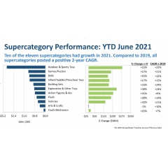 Ten of the eleven supercategories tracked by NPD had growth in 2021. Outdoor & Sports Toys continues to be the largest supercategory with $2.9 billion in sales, more than double the size of the second largest supercategory, Games/Puzzles. Outdoor & Sports Toys also had the largest dollar gain of $280 million while Plush had the fastest dollar growth versus 2020 of 39%. The only absolute dollar declines versus 2020 came from Arts and Crafts which declined -1%. This was driven by Craft Kits which makes up 42% of the supercategory. The remaining classes within Arts & Crafts all experienced growth during the first half of the year.
