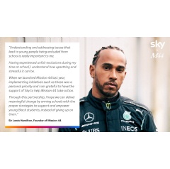 - Sky announces two-year partnership with Sir Lewis Hamilton’s foundation, Mission 44, to address disproportionate rate of school exclusions amongst Black pupils