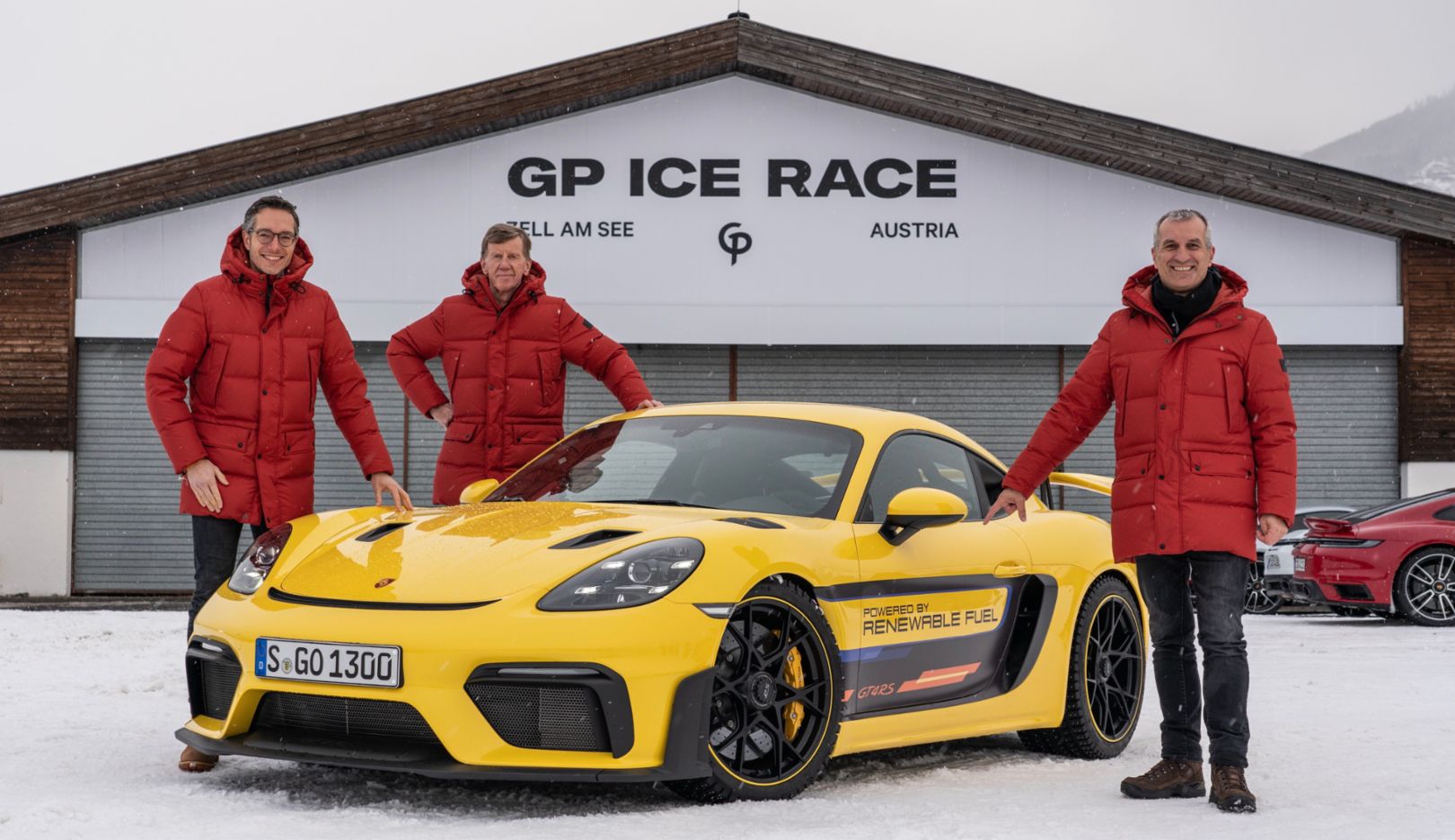 Sebastian Rudolph, Vice President Communications, Sustainability and Politics at Porsche, Walter Röhrl, Porsche Brand Ambassador, Albrecht Reimold, Member of the Executive Board for Production and Logistics at Porsche, l-r, 718 Cayman GT4 RS, GP Ice Race, Zell am See, Austria, 2022, Porsche AG718 Cayman GT4 RS: fuel consumption combined (WLTP) 13.2 l/100 km, CO₂ emissions combined (WLTP) 299 g/km, fuel consumption combined (NEDC) 12.3 l/100 km, CO₂ emissions combined (NEDC) 281 g/km