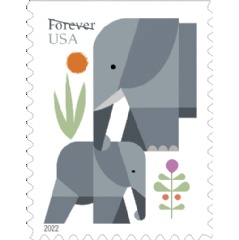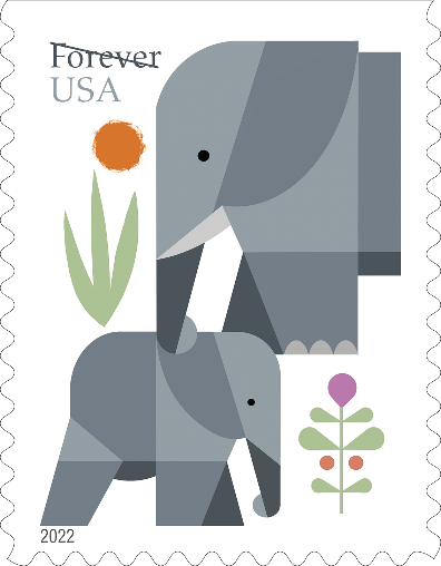 The U.S. Postal Service will celebrate elephants with this lighthearted and playful new stamp. The Elephants Forever stamp features a fanciful, digital illustration of an elephant interacting with its young calf, depicting the affectionate nature of these beloved animals.
