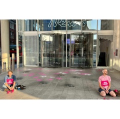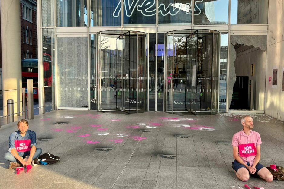 2 people from Extinction Rebellion carefully cracked 2 windows at the entrance of the News UK building at London Bridge. At the same time, 4 others – including a scientist – chalk sprayed “TELL THE TRUTH” and “40 DEGREES = DEATH” on the front of the building, and pasted recent copies of The Sun headlines about the heatwave onto windows. Special care was taken to ensure no one was hurt when the windows were cracked. The action comes just two days after six healthcare professionals, including two GPs, were arrested for breaking windows at JP Morgan’s Canary Wharf HQ.