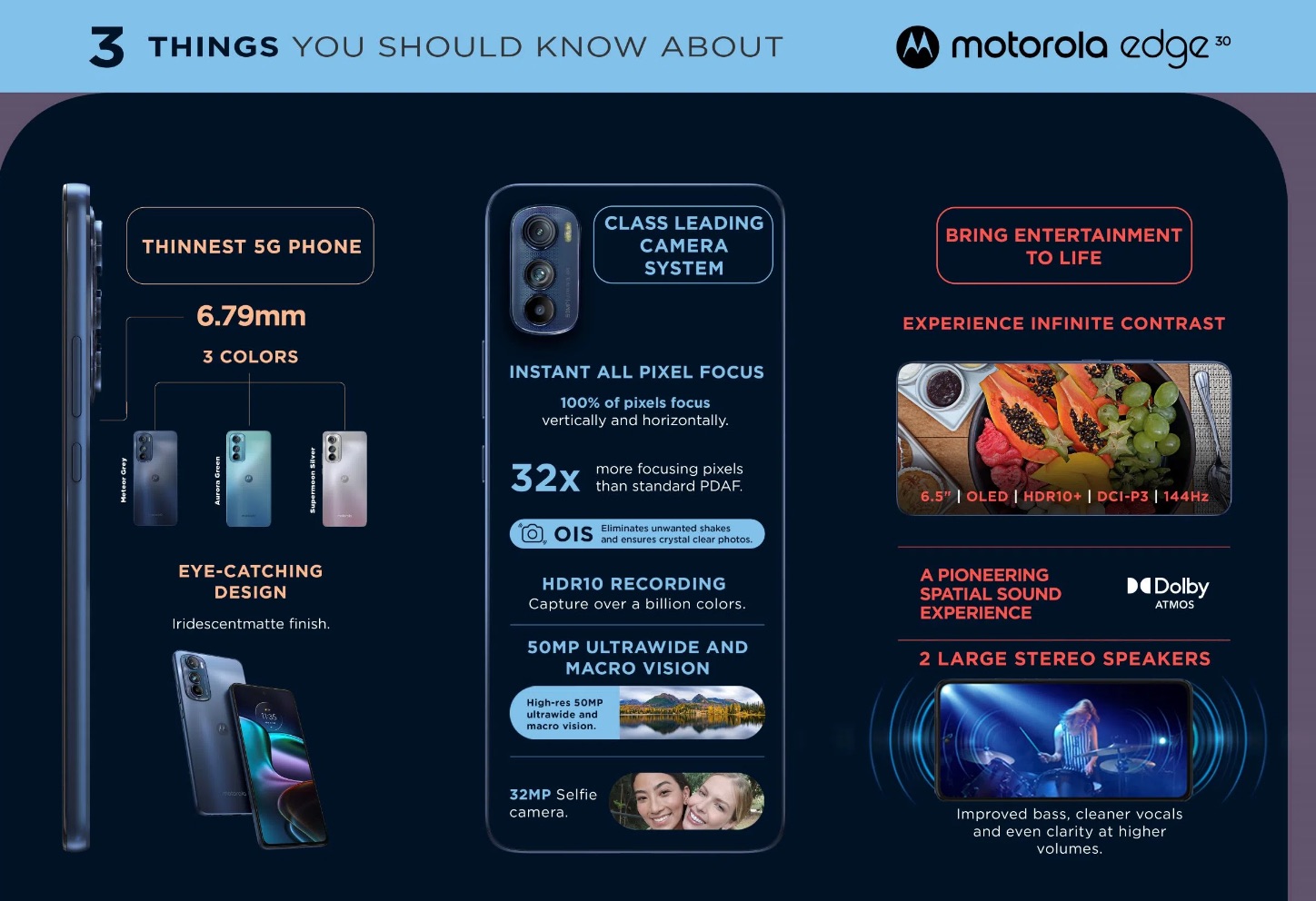 Immersive Display: Multidimensional sound with Dolby Atmos® and an ultra-smooth 144 Hz 6.5” OLED display, the device was built to give users an incredible variety of flagship experiences. From remarkably smooth gaming to rich beautifully fluid video streaming, the motorola edge 30 allows you to do more while carrying less.