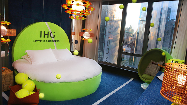 In addition to the ‘Guest How Andy Roddick Guests’ offering, IHG is giving fans the chance to stay in an over-the-top tennis-themed room, The IHG Racquet Room, at the Kimpton Hotel Eventi. The ultimate tennis lover can now sleep on a gigantic tennis ball bed or lounge on it while watching the matches. Every inch of the unique, limited-time room will be brilliantly decked out in custom, natural wooden furniture crafted from racquet material, eye-catching tennis ball lined walls and décor, and court lined turf flooring. Fans can apply to reserve the room or capture some Insta-worthy photos by emailing experienceihg@ihg.com.