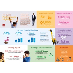 In the first half of 2022, the LEGO Group focused on expanding manufacturing capacity and building healthier inventory levels while increasing productivity following an extended period of exceptional growth rates and maxed out capacity in 2021. Due to these accelerated investments, free cash flow was DKK 3.8 billion, compared to DKK 5.8 billion in the same period last year. Net profit stayed solid at DKK 6.2 billion matching the extraordinary result in the same period last year.