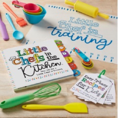 Designed exclusively for children, our Little Chefs in the Kitchen collection includes a book that helps teach basic cooking “how-tos”, Lil’ Chef In Training Apron, Easy “Peasy” Recipe Cards and “kid-sized” mixing, rolling, and measuring sets in bright, bold colors.