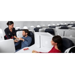 In the Business cabin (48 seats), the airline’s completely redesigned iconic seat features even more enveloping curves and extra comfort. This seat’s design is based on the 3 “F”s – Full Flat, meaning that the seat transforms into a real bed almost two metres long, Full Access, providing all passengers direct access to the aisle, and Full Privacy, ensuring optimal privacy. A new sliding door allows passengers to create a totally private space, out of sight from the other passengers in the cabin. To create a greater sense of privacy for passengers travelling together, the seats located in the centre of the cabin are now equipped with a central panel that can be lowered by pressing it down, thus creating a convivial space in which to make the most of the flight together. The seat also features a wide 17.3-inch 4K High-Definition anti-glare screen with a noise-reducing headset, a new Bluetooth connection allowing passengers to use their own headphones and several electric sockets.