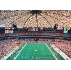 Still standing today but currently unused, the Astrodome’s circular shape has an outer diameter of 710 feet, covers 9.14 acres, and the clear span of the domed roof is 642 feet. The diameter of the playing field is 516 feet, and the maximum height of the roof above the playing field is 213 feet. Original seating capacities for the nine-level multi-purpose stadium ranged from 45,772 for baseball, 52,382 for football, 55,000 for conventions, and 66,000 for boxing. In 1989, 10,000 new seats were added to the facility to increase the capacity for baseball and football games. The stadium was constructed for just over $45 million (1960s dollars), and the structural costs totaled $5.3 million for the stadium and $1.5 million for the domed roof.