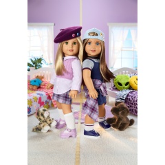 The twins’ story comes to life in a ’90s-inspired product collection that reflects the era and the girls’ unique styles and interests. The 18-inch Isabel™ doll features green eyes and medium-length blonde hair with platinum highlights and comes dressed in a purple sweater with attached pinstripe shirt, a multicolored plaid skirt, and pink platform shoes. Further reflecting her love of pink and preppy fashions, Isabel’s accessories include a beret with replicas of American Girl’s ’90-era Grin Pins attached, pink sunglasses, beaded flower necklace, and transparent mini backpack.
