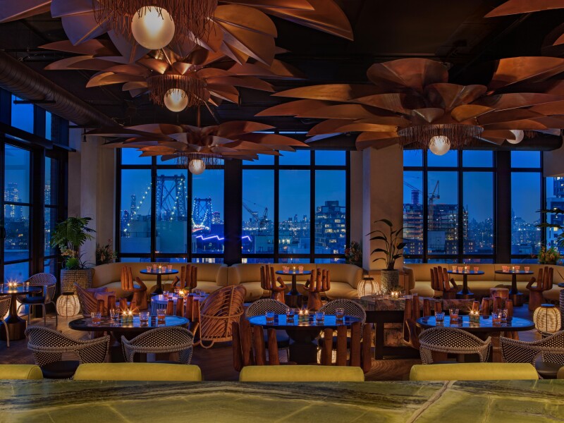 Opening this spring, LilliStar, Moxy Williamsburg’s indoor/outdoor rooftop bar will blend contemporary Indo-Aussie beach culture with Brooklyn energy, creating a unique setting for tropical-inspired cocktails, Balinese beach barbecue, and dramatic views. Giant lotus flowers carved from copper, glass and leather form a dramatic ceiling sculpture in the lounge, where floor-to-ceiling windows open onto an expansive roof deck with show-stopping views of the Manhattan skyline and the iconic steel trusses of the Williamsburg Bridge. Playful cocktails, including large-format drinks for the whole table to share, incorporate tropical fruits and Southeast Asian spices.