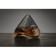 The carbon fibre element of the decanter has been created using a unique process which mirrors the mokume texture and mimics a natural aesthetic, much like wood grain or layered natural rock. The finish achieved can be said to imitate both the black rocks in the bay of Loch Indaal, home to the Bowmore Distillery, and also the inside of the charred cask where this special 52-year-old whisky was aged.