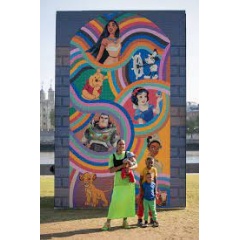 Talking about the inspiration for her mural, Lakwena referenced the Disney characters that inspired her creativity as a child, and those she sees sparking the imagination of her two sons today: “When I lived in Ethiopia as a child in the 90s, there wasn’t access to many films, so we would watch Disney videos on repeat. Later, when living in the UK, I also remember visiting my uncle in the Ashdown Forest, which inspired Winnie the Pooh, and we would play Pooh Sticks on Pooh Bridge. And now, with my young family, films like The Lion King offer a nice way for me to talk to my children about our ancestral homeland. The idea of magical possibilities that Disney captures so well definitely had a big impact on my imagination as a child, and has therefore informed my adult work and life as an artist.”