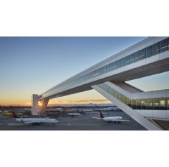 The 85-foot-high pedestrian bridge immerses arriving passengers in panoramic mountain range views, and bares its structural features, echoing the cranes of Seattle’s industrial waterfront. The integrated architectural and structural design enabled the bridge’s centerspan to be fabricated off-site, and swiftly hoisted into place, minimizing the impact of construction on airport operations.