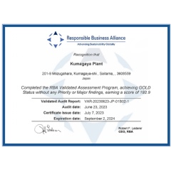 Obtaining of Gold Status showcases that Kumagaya Plant is complying with the RBA Code of Conduct at a high level, and is in line with the requests of customers who place importance on its conformity.