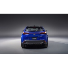 A similar contribution is made by the rear combination lamps. Unique Aero Stabilizing Blade Lights begin at the top of the rear fenders and span the rear of the vehicle, projecting a distinctive nighttime signature formed by a sequence of 120 LEDs tapering toward the center. By guiding airflow around the rear of the UXh, this design also reduces turbulence and lift, benefiting vehicle stability when cornering and driving in crosswinds. A wing-type spoiler at the rear edge of the roof, along with a flat underbody, contribute to vehicle quietness, fuel efficiency, and aerodynamics.