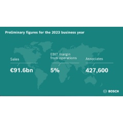 The Bosch Group met its expectations despite the challenges of the 2023 business year: According to preliminary figures, the supplier of technology and services generated1 sales of 91.6 billion euros and thus grew 8 percent after adjusting for exchange-rate effects (nominal growth of 4 percent). The EBIT margin from operations reached 5 percent, a slight improvement on the previous year (4.3 percent), and thus met expectations. “For Bosch, 2023 was tougher than expected. Through a supreme effort, we were able to increase our sales and improve our margins. We made progress despite the strong headwind,” said Dr. Stefan Hartung, chairman of the board of management of Robert Bosch GmbH, at the presentation of the company’s preliminary business figures. “Given the difficult conditions, this is an impressive achievement by our associates. The years ahead will demand a lot from all of us as well.