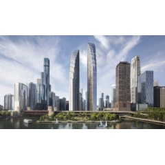 Reaching nearly 900 feet, the new tower is articulated with terraces that cascade down its facades, and its ground level will connect the Chicago Riverwalk to the future DuSable Park by the lakefront.