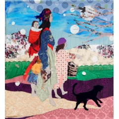Mirga-Tas brings attention to the everyday life of her community – their relationships, alliances, and shared activities – by depicting those closest to her, including family members, collaborators, fellow artists and activists. Often working together with other women, she creates patchworks from materials including curtains, jewellery, handkerchiefs, shirts, and sheets, which are sewn together to form what she calls ’microcarriers of history’. She also re-imagines artworks from across the centuries that have presented Roma identity in negative ways and transforms them into vibrant images imbued with strength and dignity. The works combine realism with the building of a visual dictionary of Romani culture, alongside scenes which present figures and animals in an abstracted space. The artist has also looked back to specific historical moments, including creating works commemorating victims of Romani genocide during the Second World War.