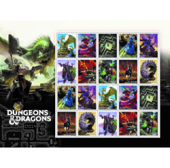 The pane of 20 DUNGEONS & DRAGONS stamps features 10 different designs that highlight characters, creatures, and encounters familiar to players of D&D: