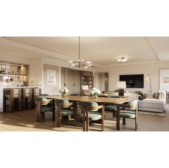 Progressing through each space of the reimagined accommodations reveals elements of surprise, with every area having its own unique charm. The refined residential style combines elegant furniture, opulent touches, and bold playful patterns to evoke the setting of a luxurious private residence in the heart of Miami. Timber floors, energetic graphic rugs, antique metal details, sculptural sofas, and custom pieces contribute to the stylish ambiance. Generous living room spaces highlight open floor plans with impressive features down to the details such as the Verner Panton-designed table lights that grace the custom limed-oak bars. Bathed in natural sunlight, the spacious bedrooms offer a peaceful retreat. Soft and neutral tones are enlivened with a mix of rich materials and textures, creating a feeling that is bright and open with cozy sofa corners and dressings areas.