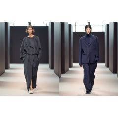 The womenswear mainline collection embodies contemporary femininity, brought to life through modern tailoring. Trouser suits with softened structures and oversized, fluid silhouettes define the look. Elegantly refined, sheer separates and floor-length dresses featured alongside relaxed wool coordinates, duffle coats, smooth leather jackets and shearling. The looks are styled with leather loafers, pointed kitten heels or ballet flats, complemented by quilted clutch bags. Menswear focuses on reinventing classic wardrobe staples. Formal tailoring is relaxed for day-to-evening dressing with barrel-leg trousers that are cut to fit loosely on the body, worn with draped silk shirts for a softer aesthetic. Fluid trousers are paired with oversized jackets featuring leather detailing, while tonal looks combine suiting with tactile cashmere layers.
