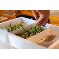 Salicornia and arthrocaulon can be eaten fresh, steamed, blanched or boiled. In simple or elaborate salads, soups, poke bowls, ceviches, dressings and even as a "pesto"