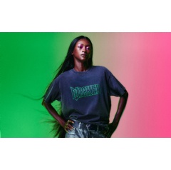 The collection’s silhouettes conjure up a sharply tailored black blazer with an hourglass shape, a black bandeau top with wiring that creates curved details, and a black dress with spaghetti straps, a draped top and asymmetric hemline. There’s also an oversized washed black crewneck logo sweater with distressed details, a boxy washed black hoodie with silver foil logo at the back, and four different merch t-shirts featuring graphics of Elphaba, Glinda and the Wicked logo. Different fabrics and techniques emphasise rich textures – mesh, wooly woven, heavy washed jersey, distressed knits, embroidery and pleather. For the accessories, the focus is on the ‘W’ with a curvy handbag, sparkly earring and embossed belt.