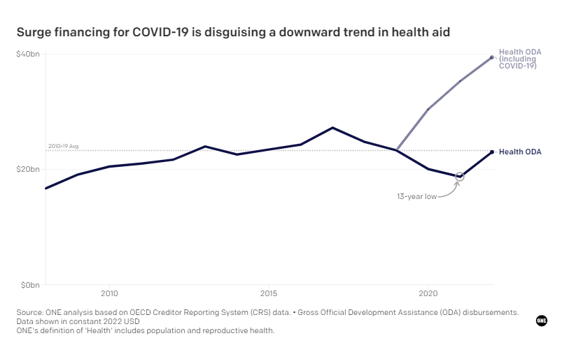 Ahead of the World Health Summit in Berlin (13-15 October), new analysis by The ONE Campaign reveals a worrying trend in global health financing: When COVID-19 funding is excluded, official development assistance (ODA) for health reached a 13-year low in 2021 with only a slight rebound in 2022. This data suggests major donors are deprioritizing health investments in the wake of COVID-19 and as other health threats like Mpox continue to spread.