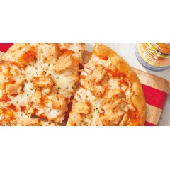 The new Spicy Rosé Flatbread Pizza features a spicy and creamy tomato sauce, slow cooked chicken, shredded mozzarella and Monterey Jack, and herb seasoning on a crispy garlic-oil brushed Flatbread Pizza base.