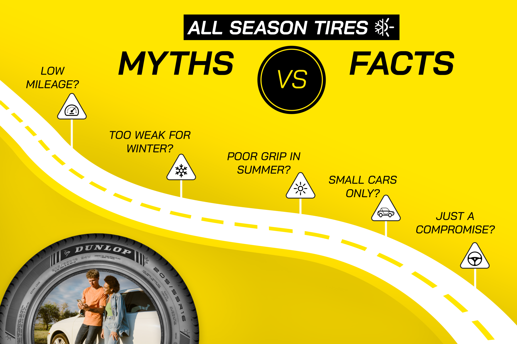In contrast to the previous myth, some drivers actually have the misconception that all-season tires only perform well in winter. With the latest technologies, modern all-season tires represent a huge step forward, delivering great dry performance as well as winter grip. This means drivers won’t be left wanting more on long summer road trips. They can feel confident and prepared, knowing that their tires are developed for use in all weather conditions.