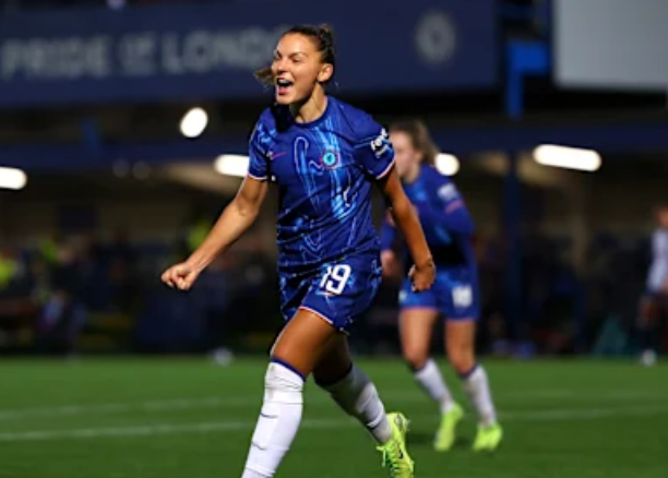 Blues captain Millie Bright sent an inviting cross to the back post and Rytting Kaneryd used her instep to connect with the ball and volley it across the face of goal and into the far corner of the net.