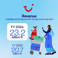 TUI Group again ended the financial year 2024 with a significant increase in operating earnings. Thanks to robust customer demand, underlying EBITA increased by 33 per cent year-on-year to 1.3 billion euros. Revenue was up 12 per cent year-on-year to 23.2 billion euros (previous year 20.7 billion euros). All Group segments, in particular Hotels & Resorts as well as Cruises, contributed to this positive operational performance.