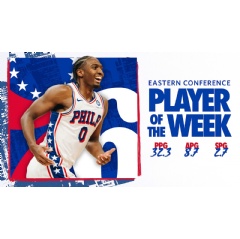 In three games – all wins – against San Antonio, at Boston, and at Utah, Maxey produced 32.3 points (3rd in NBA) on 46.5-percent shooting, 4.7 rebounds, 8.7 assists, and 2.7 steals. No other player averaged such numbers throughout the week.