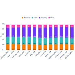 In 2024, the broadcast category accounted for 20.3%—24.2% of viewership; cable showed higher numbers—25.9%—29.1% while streaming was the absolute leader last year and accounted for 35.9%—43.3%.
