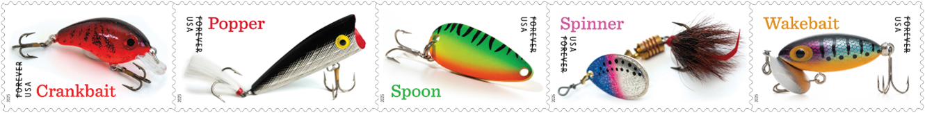 The first-day-of-issue event for the Freshwater Fishing Lures stamps is free and open to the public. News of the stamps is being shared with the hashtag #FishingLuresStamps.