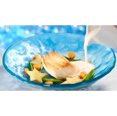 - Sea Bass (Atlantic) –a delectable portion of Sea Bass nestled amid the subtle sweetness of carrot mochi and vibrant crunch of fresh sugar snap peas. Aromatic lemongrass broth complements the buttery bass, while starfruit slices add a splash of tropical citrus notes