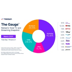 The Gauge™ is Nielsen’s monthly snapshot of total broadcast, cable and streaming consumption that occurs through a television screen, providing the industry with a holistic look at what audiences are watching. The Gauge was expanded in April 2024 to include The Media Distributor Gauge, which reflects total viewing by media distributor across these categories. Read more about The Gauge methodology and FAQs.