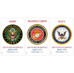 The U.S. Postal Service to proudly unveil three individual commemorative stamps honoring the 250th anniversaries of the U.S. Army, U.S. Navy and U.S. Marine Corps, recognizing the enduring legacy and unwavering dedication of these vital branches of the American military.
