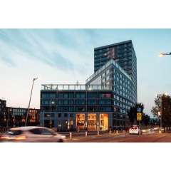 ArchitectureThe design consists of three volumes that are subtly rotated in relation to each other. This creates a stepped building that presents itself differently from every side. The façades are constructed from prefabricated elements with rich detailing and use of materials. A striking feature is the use of deaf façades with impressive windows that let light in but keep noise out. Instead of individual balconies on the outside, collective outdoor spaces have been created within the walls of the building and on the roofs. This creates a peaceful and sheltered living environment in the hustle and bustle of the city.