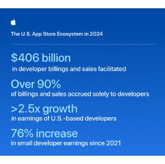Apple today announced the App Store ecosystem in the U.S. facilitated $406 billion in developer billings and sales in 2024, according to a study conducted by Professor Andrey Fradkin from Boston University Questrom School of Business and economist Dr. Jessica Burley from Analysis Group. Importantly, for more than 90 percent of the billings and sales facilitated by the App Store, developers did not pay any commission to Apple.