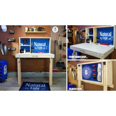 The ToolBar is a garage-friendly station that seamlessly transforms from workspace to a post-task man cave simply by folding it up. With Murphy bed technology applied to a workbench, the ToolBar offers a space-saving solution that can be raised or lowered to function for work time or Natty time. When flipped down, your ultimate DIY zone is revealed with a pegboard to hang your tools and a flat work surface with enough space to fix and fiddle like a pro. When folded up, that same surface transforms into a post-work celebration station, featuring a built-in dartboard and can holders to toast your DIY masterpiece with an ice-cold Natural Light.